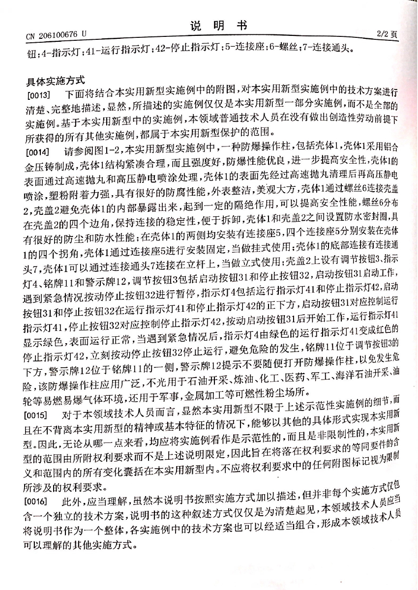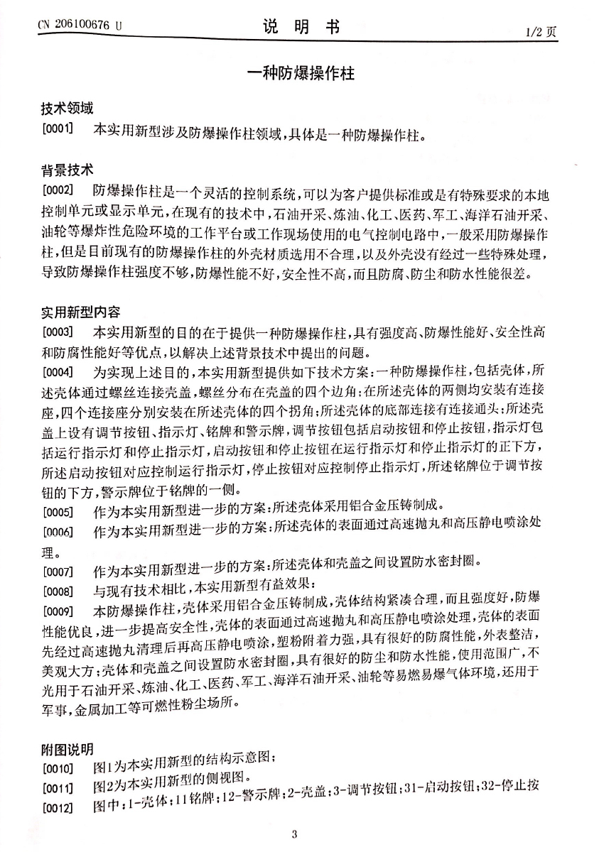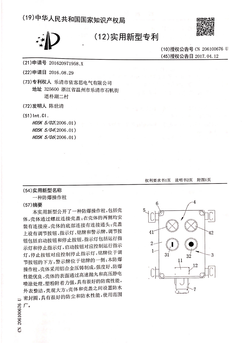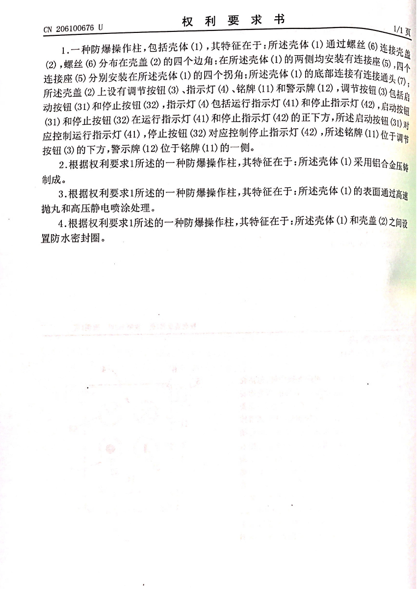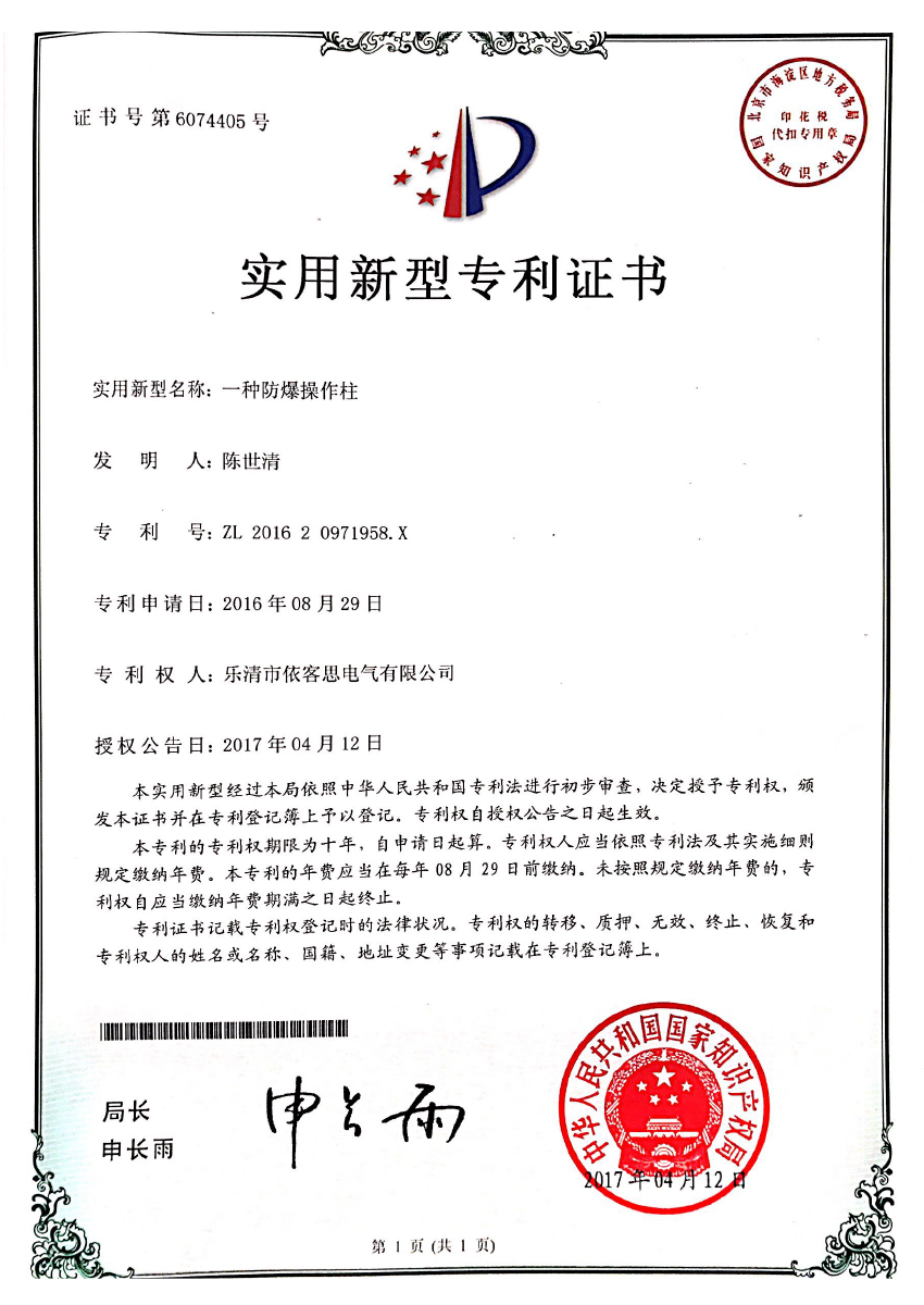 防爆操作柱專利證書